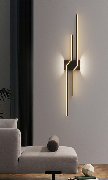 Geometric LED wall light with warm ambient backlighting.