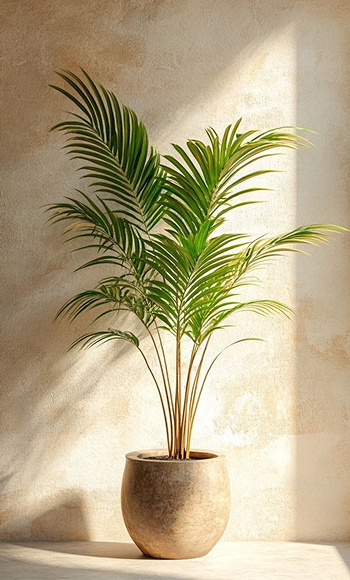 Elegant areca palm in a warm textured ceramic pot.